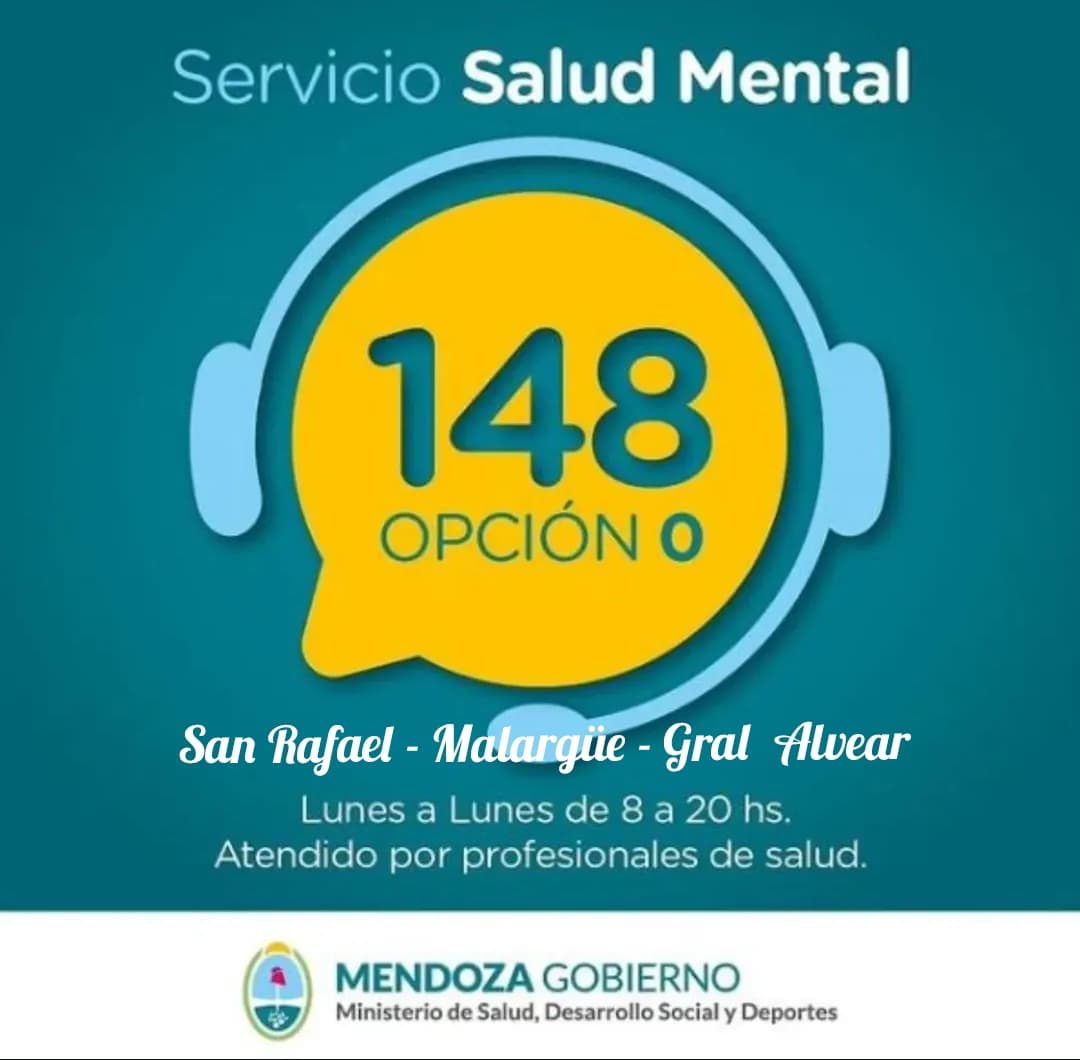 Si estás atravesando un momento difícil o conoces a alguien que lo esté, recuerda que no estás solo/a. En Mendoza, Argentina, la línea telefónica 148 (opción 0) es un servicio gratuito y disponible las 24 horas del día, brindando orientación y acompañamiento en salud mental. Profesionales capacitados atienden la línea para ofrecer un primer contacto y derivar a otros espacios de atención. Además, se recomienda llamar al 911 en situaciones de riesgo de vida. Si te sientes mal o necesitas apoyo emocional, también puedes dirigirte al Hospital Regional Malargüe, donde actualmente se encuentra disponible la guardia de psicología, para ofrecerte la contención necesaria en momentos de crisis.