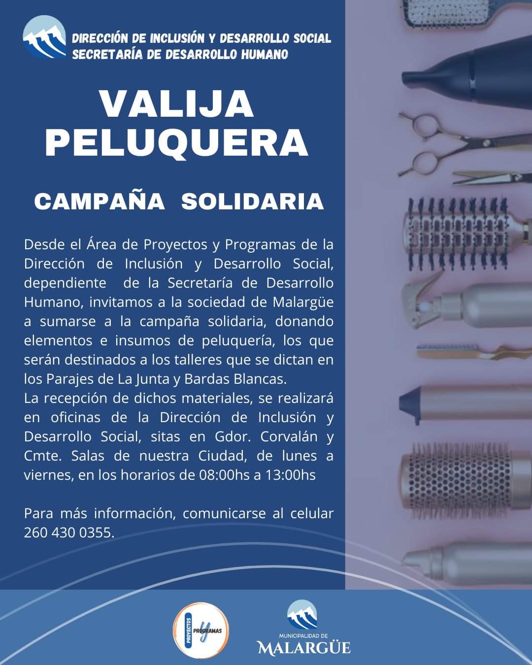 Desde el área de Proyectos y Programas de la Dirección de Inclusión y Desarrollo Social, dependiente de la Secretaria de Desarrollo Humano, invita a la comunidad malargüina a sumarse a la campaña solidaria «Valija Peluquera».