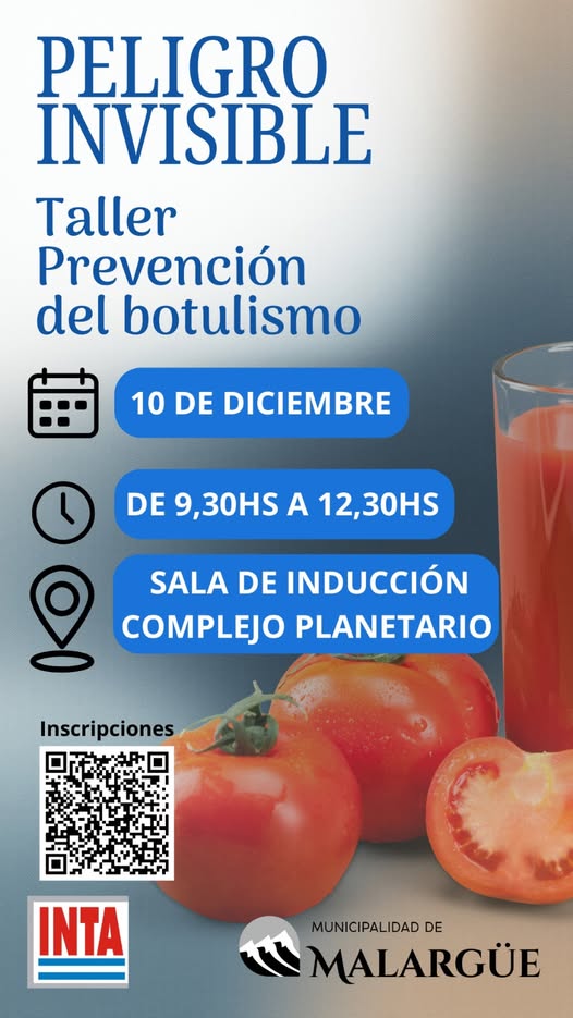 El próximo 10 de diciembre, la Dirección de Bromatología, junto con el Instituto Nacional de Tecnología Agropecuaria (INTA), llevará a cabo un taller gratuito sobre la prevención del botulismo, titulado “Peligro Invisible”. Este evento se desarrollará de 9:30 a 12:30 horas en la Sala de Inducción del Complejo Planetario de Malargüe.