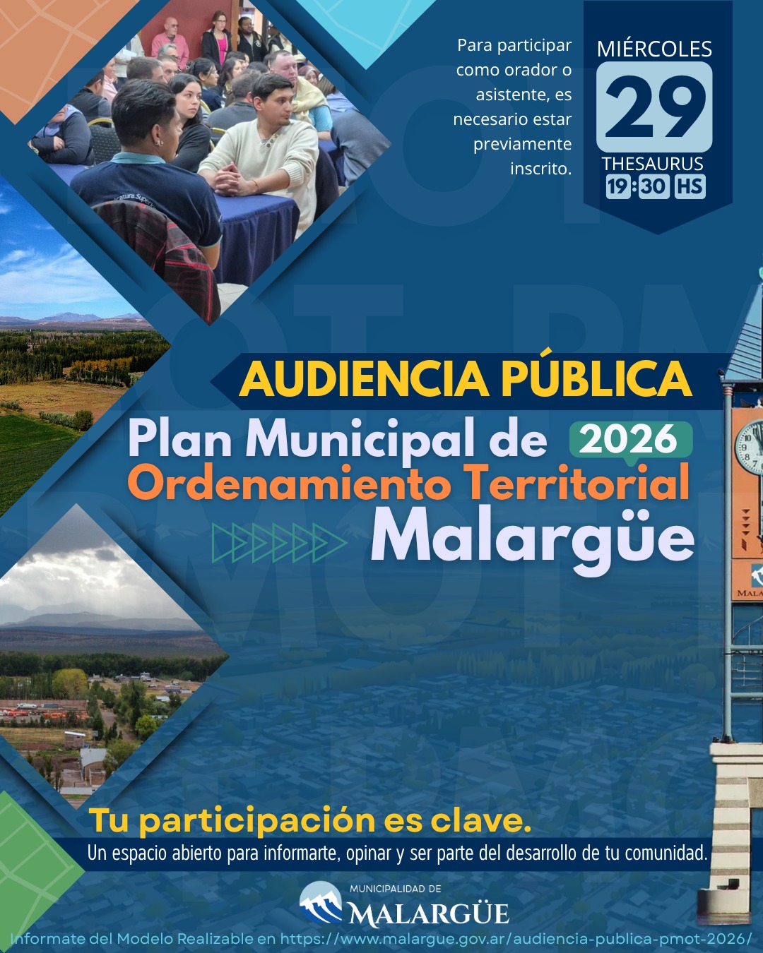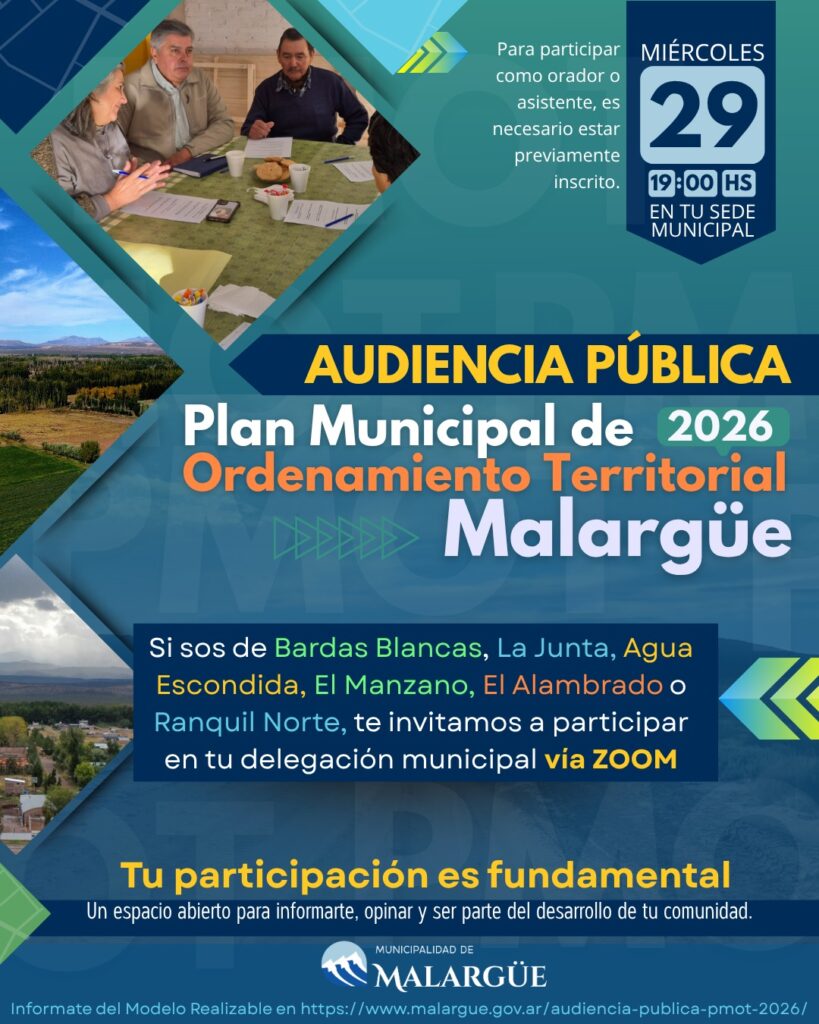La Municipalidad de Malargüe informó que se encuentra en la etapa final de inscripción para participar en la Audiencia Pública del Plan Municipal de Ordenamiento Territorial (PMOT) 2026, un instrumento estratégico que proyecta el crecimiento y la organización del territorio en las próximas décadas.