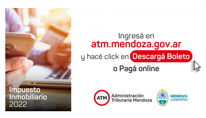 La Administración Tributaria Mendoza (ATM) informó que hasta el viernes 30 de septiembre hay tiempo para abonar en término la cuarta cuota del Impuesto Inmobiliario 2022. El boleto se puede obtener y pagar en línea dentro de los botones “Descargá Boleto” y “Pagá Online”, en www.atm.mendoza.gov.ar.